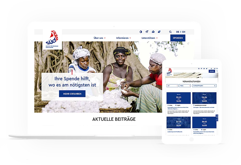 Damit alle SÜDWIND-Materialien fortan besser auffindbar und abrufbar sind, haben wir für SÜDWIND e.V. eine funktionale Such- und Sortierfunktion aller produzierten Bildungsmaterialien erstellt. Weiter haben wir uns auf Suchmaschinenwerbung und Suchmaschinenoptimierung (SEO) konzentriert. All unsere Maßnahmen haben wir im anwenderfreundlichen TYPO3 CMS mit einem einfach erlernbaren Redaktionssystem umgesetzt. Die Mitarbeiter des SÜDWIND e.V. wurden in einer entsprechenden Schulung mit den Neuerungen und der Bedienung der Webseite vertraut gemacht. Da nur messbare Erfolge real sind, haben wir für SÜDWIND e.V. ein Tool für detailliertes Tracking implementiert. Dazu kommen die verbesserte User-Navigation und die Integration externer Spendentools für eine erleichterte Einwerbung der Mitglieder und Spendenbeträge. Alle Informationen für Partner*innen und Interessierte sind durch die Bereitstellung eines Zugangs auch in englischer Sprache abrufbar.